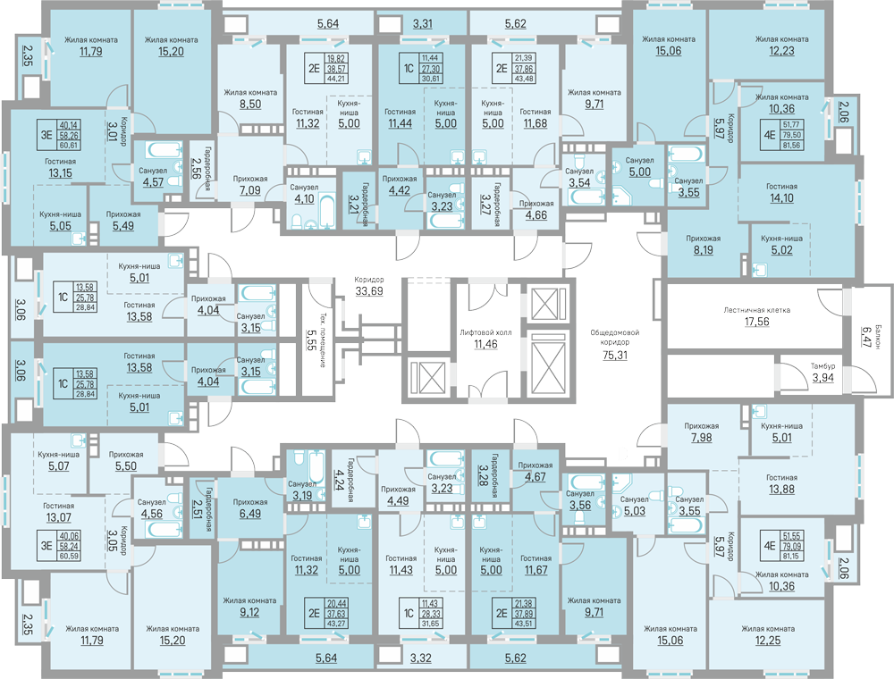Количество этажей в каждом доме: 16