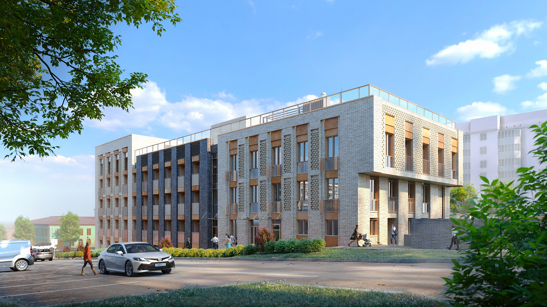 “Мы стремились вернуть этому месту масштаб и ритм губернского города, поэтому фасад разделён на пластические и цветовые блоки, которые визуально делят объём как бы на отдельные здания. Применение трёхмерной кирпичной кладки отсылает к традициям исторической застройки в современной трактовке и придаёт зданию выразительность”.