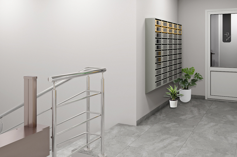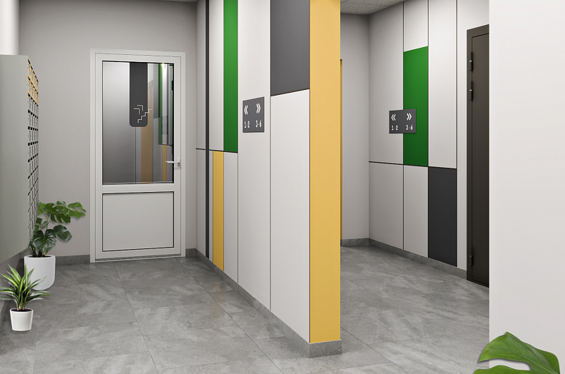 Современный и минималистичный холл. Сочетание цветов в отделке смотрится выигрышно и лаконично. Уверены, что входная группа в строящемся доме станет местом притяжения соседей, а жильцы почувствуют комфорт родного дома, лишь переступив порог парадной.