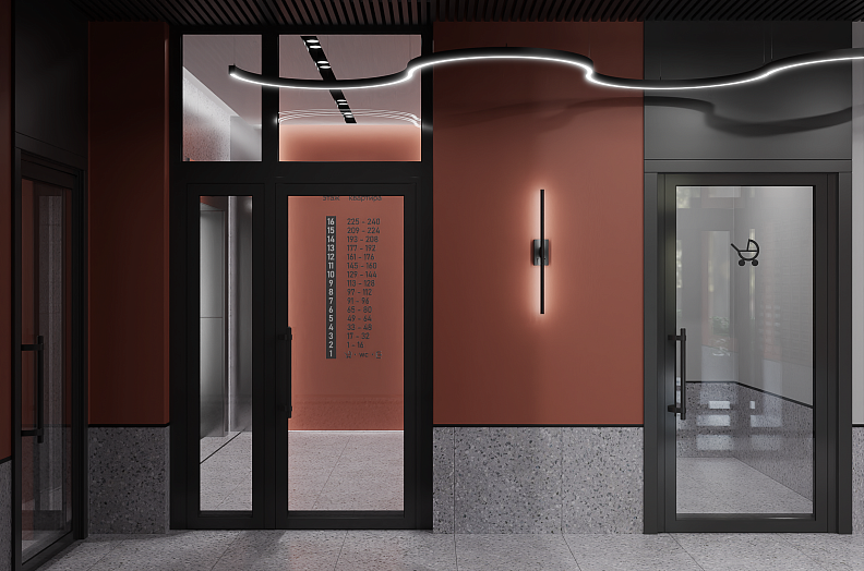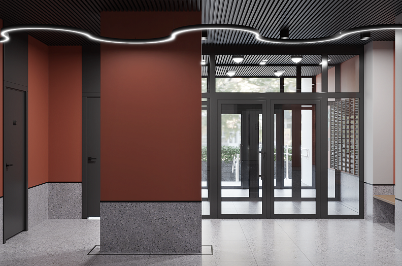Дизайнерские холлы в ЖК «Ближе» — это продуманный подход к комфорту и высокая эстетика. Безбарьерный вход в подъезд будет удобен для всех. Входная группа с витражным остеклением — это не только стильно, но и безопасно: всегда видно, что происходит внутри и снаружи. А для дополнительной безопасности в ЖК предусмотрена комната консьержа.