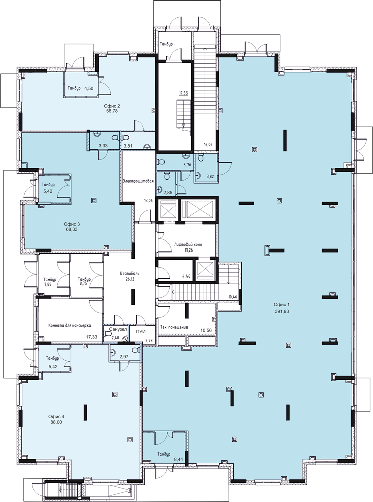 Высота потолков: 1-й этаж - 3,3 м, типовой этаж - 2,54 м