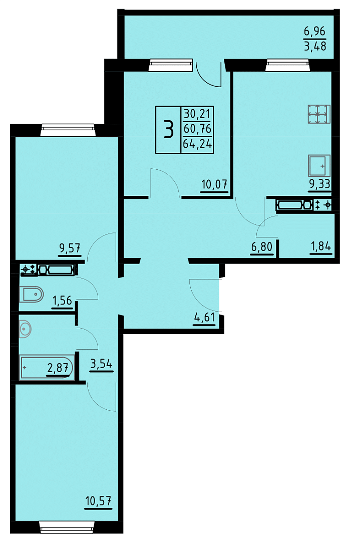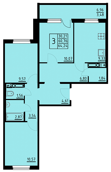 3-комнатная , 63.96 м²