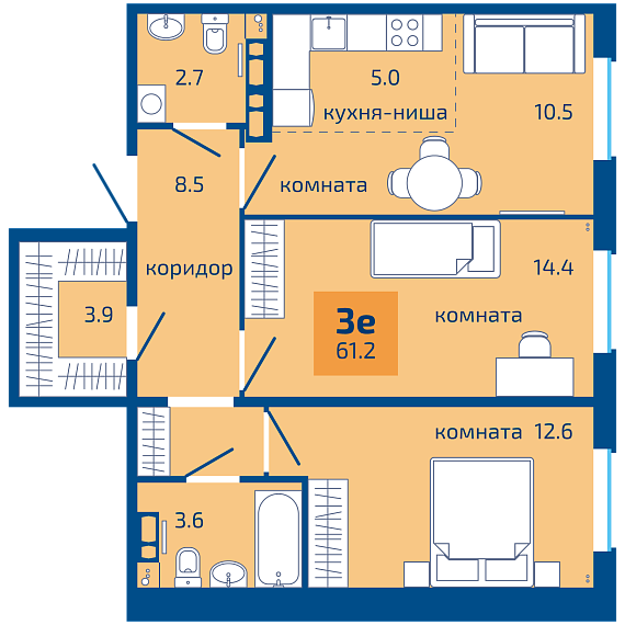 Для тех, кто ценит готовые решения, предлагается вариант «Чистовая отделка» в уютных светлых тонах. Квартира сдается полностью готовой к заселению: обои в теплых нейтральных тонах, уложены напольные покрытия, установлены плинтуса и выполнена чистовая электрика. Вам останется лишь расставить мебель и добавить детали интерьера — никаких дополнительных работ не требуется.