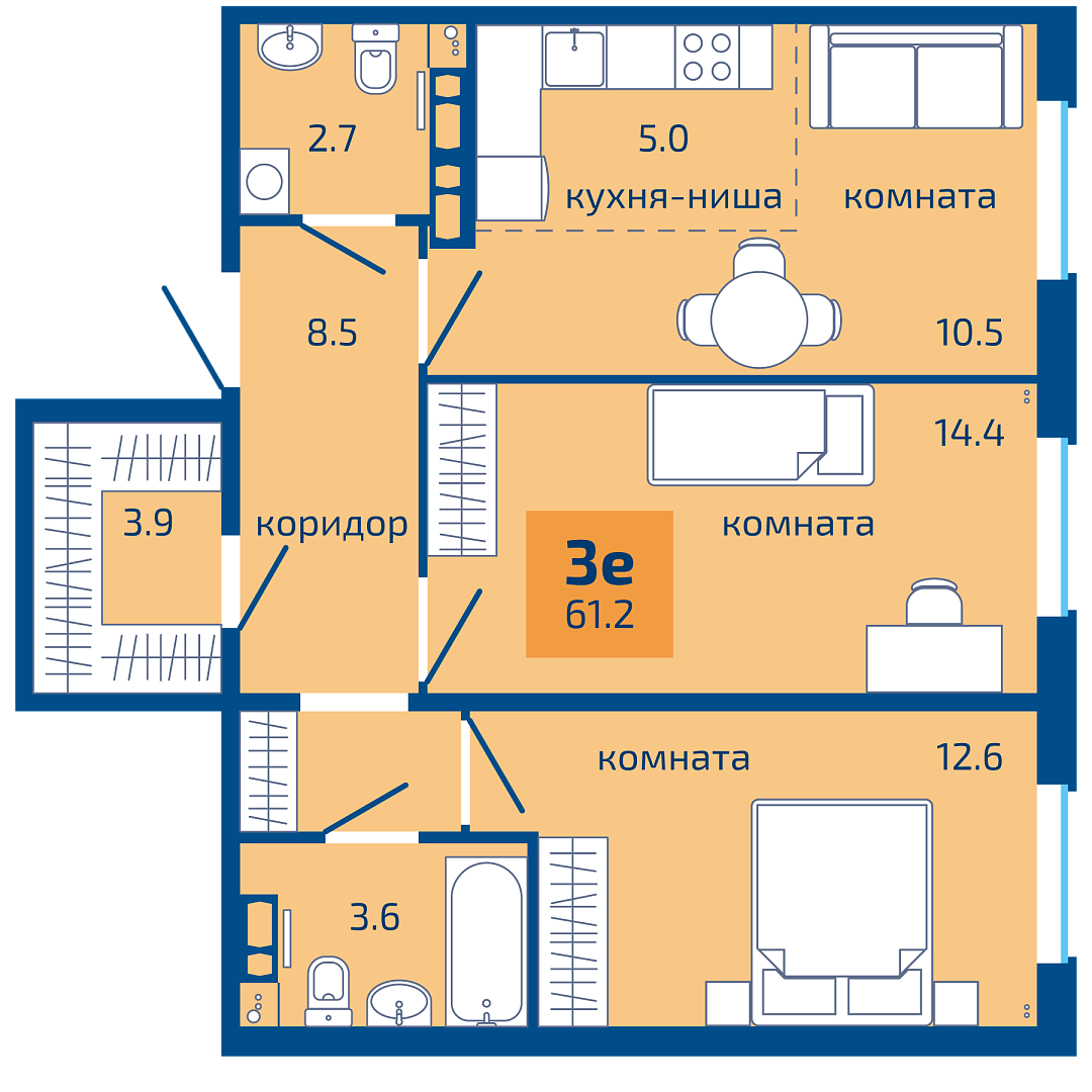 Для тех, кто ценит готовые решения, предлагается вариант «Чистовая отделка» в уютных светлых тонах. Квартира сдается полностью готовой к заселению: обои в теплых нейтральных тонах, уложены напольные покрытия, установлены плинтуса и выполнена чистовая электрика. Вам останется лишь расставить мебель и добавить детали интерьера — никаких дополнительных работ не требуется.